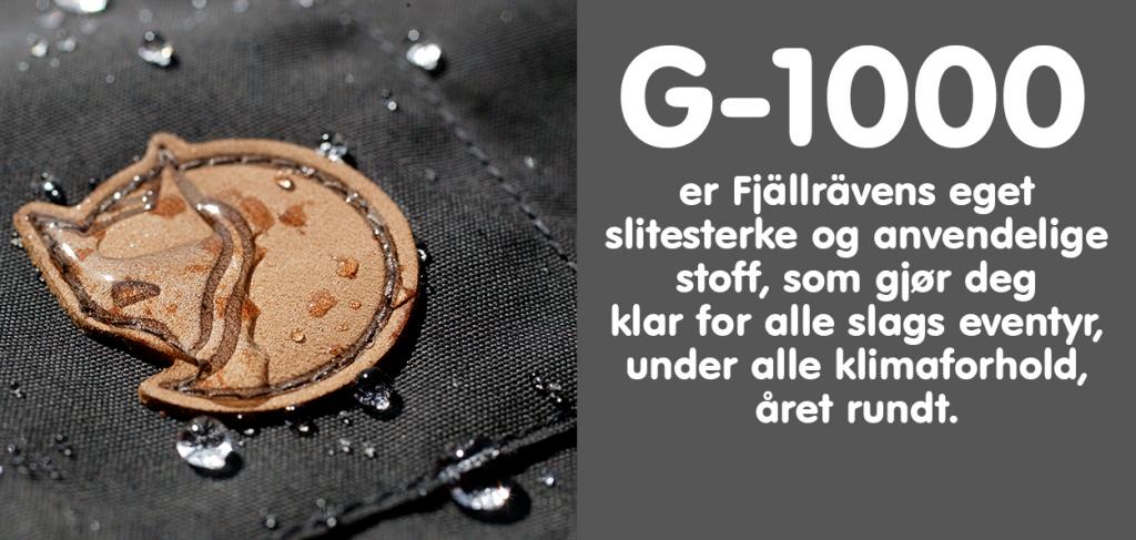 G-1000 er Fjällrävens eget slitesterke og anvendelige stoff, en velutprøvd friluftsklassiker som gjør deg klar for alle slags eventyr, under alle klimaforhold, året rundt. Det tettvevde stoffet (65 % polyester og 35 % bomull av høyeste kvalitet) er behandlet med Greenland Wax. Den kombinasjonen gjør G-1000 til et av verdens beste friluftsstoffer, med en rekke fordelaktige egenskaper: