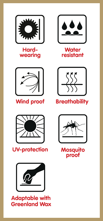 • Vannavstøtende Greenland Wax gjør G-1000-plaggene svært motstandsdyktige mot regn og fuktighet. Det betyr at du kan bruke dem når det kommer en regnskur. Stoffet tørker raskt hvis det blir vått.
