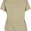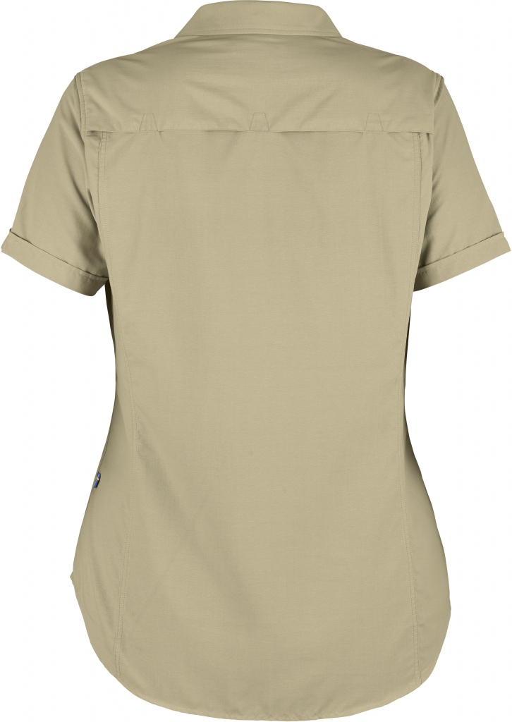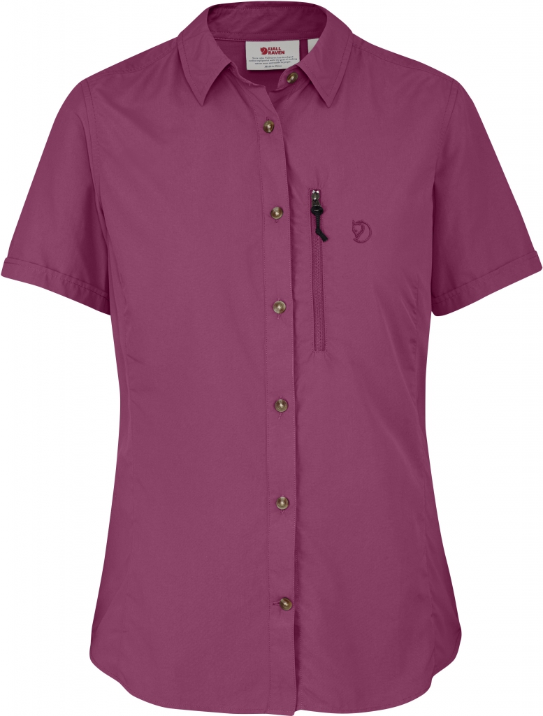 Lett og behagelig kortermet skjorte til fotturer og annet friluftsliv om sommeren. Sydd i et mykt funksjonsmateriale som transporterer fuktighet og kjennes svalt mot huden. Et praktisk plagg som tar lite plass i sekken – nyttig når det er begrenset med plass.Velsittende feminint snitt som er formsydd bak. Knepping foran og ventilasjonsåpning på bærestykket for slippe ut overflødig varme. Vertikal brystlomme med glidelås og nettingfôr. Innebygget UV-beskyttelse UPF 20+.