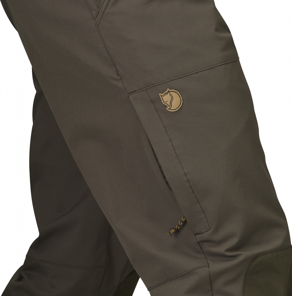 Elastisk stoff i den øverste delen av buksen og over lårene med G-1000 Lite på knær og legger for ekstra slitestyrke i terreng med mye busk og kratt.