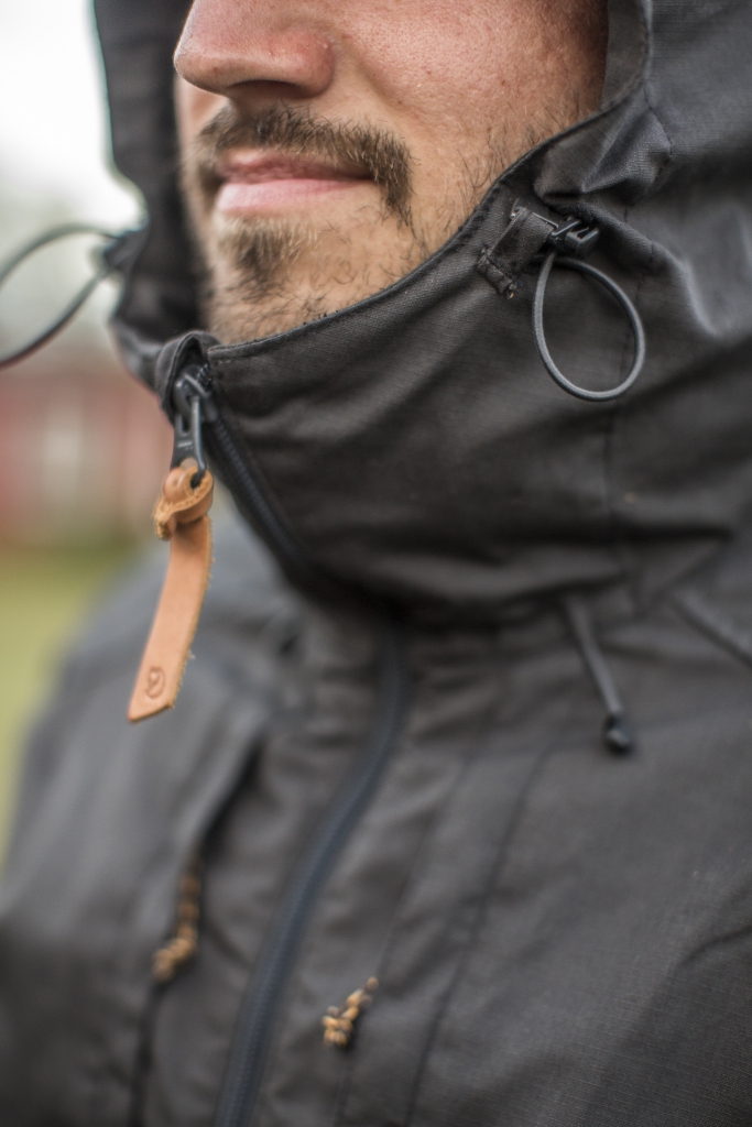 Fast hette med enkel justering rundt åpningen. Toveis glidelås med en beskyttende klaff på innsiden og en trykknapp i falden nede.