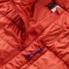 Kraven er høy og det er en halvlang glidelåsåpning i front. Den store kengurulommen med glidelås tilbyr rask varme til frosne hender. Den fungerer også som en pakkepose, slik at du kan bruke jakken som en liten pute – perfekt når man camper. Det er også en brystlomme med glidelås. Snøring som kan strammes rundt nedre kant, rundt håndleddene er det elastiske kanter.