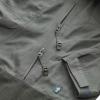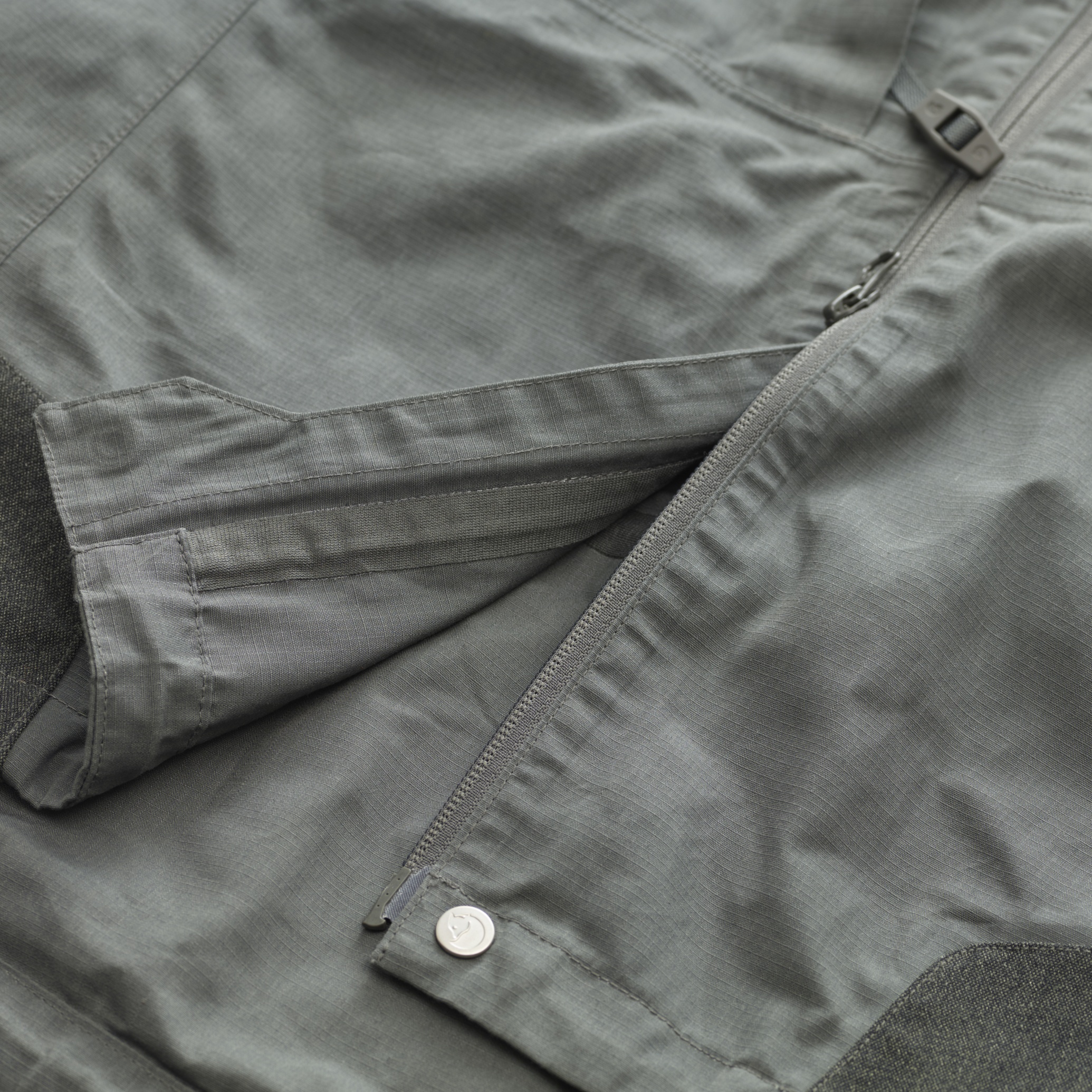 To brystlommer med gjemte glidelåser. Nettinglommer inni brystlommene. Toveis glidelås med innvendig beskyttelsesklaff. Ventilerende glidelås i sidene.