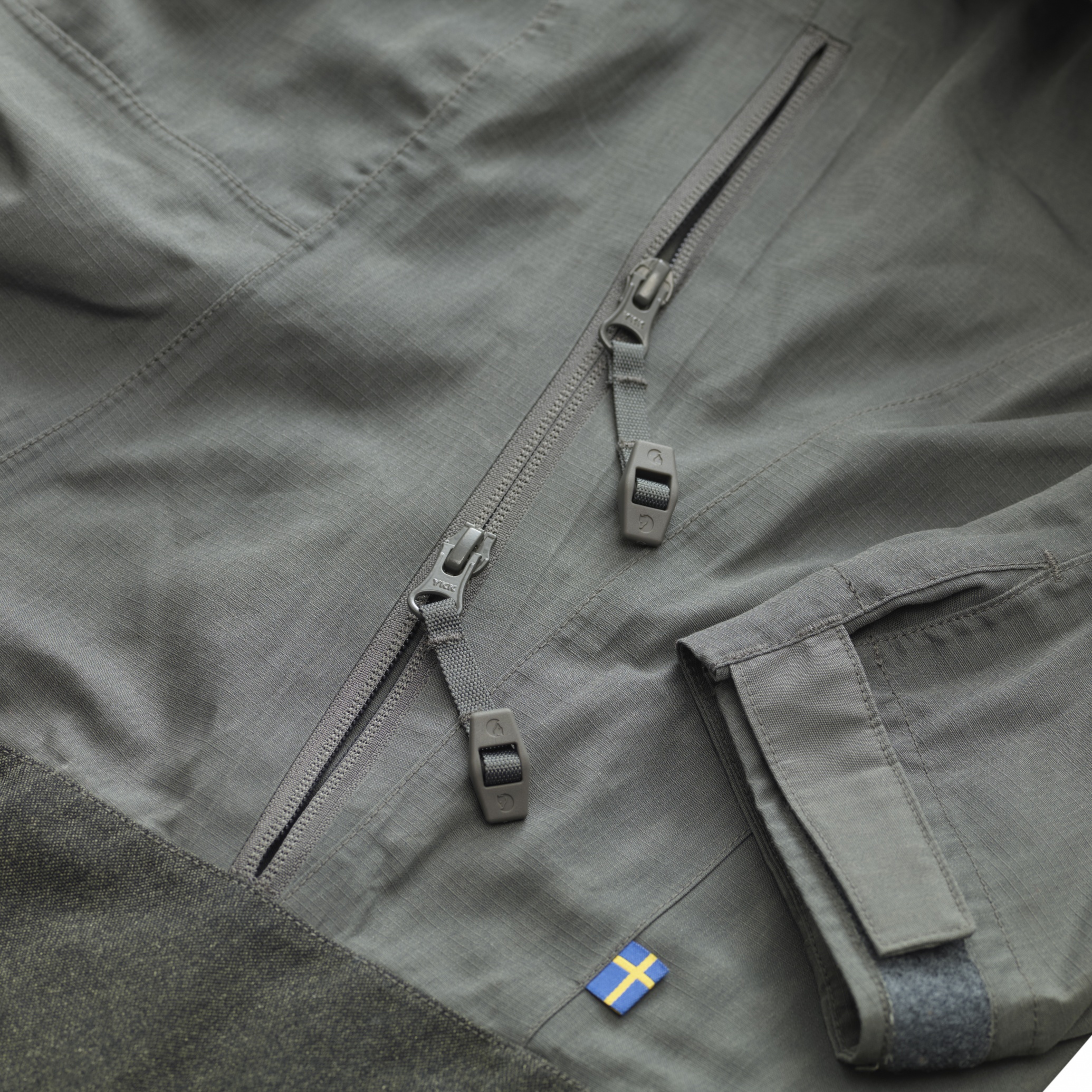 Glidelåsdrager med enkelt grep. Borrelåsjusteringer på ermet rundt håndleddene. Snørejustering langs kanten. RECCO-markør.