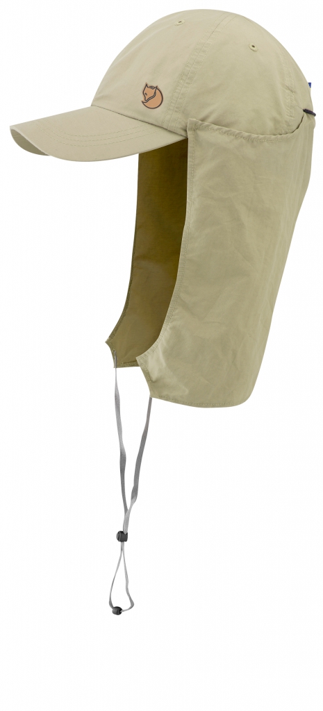 Praktisk skyggelue til reiser i hurtigtørkende materiale med nedfellbar solbeskyttelse for nakken.