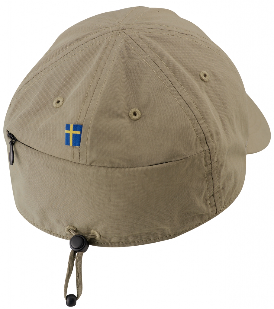 Praktisk skyggelue på reiser med nedfellbar solbeskyttelse for nakken og lomme til oppbevaring midt bak.