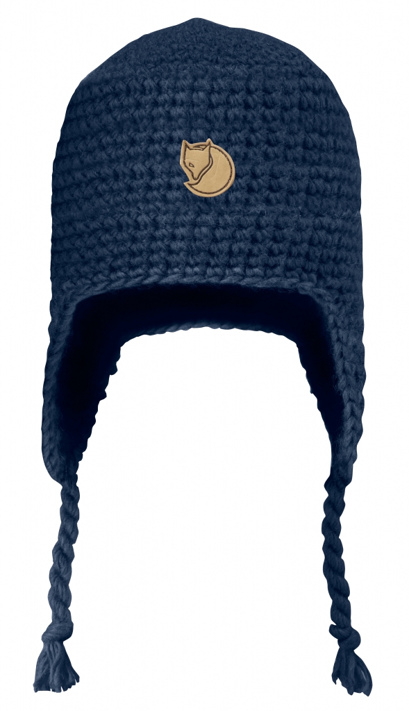 Heklet lue i ull-/akrylblanding med ørelapper. Knytebånd med dusker og liten logo i skinn foran.