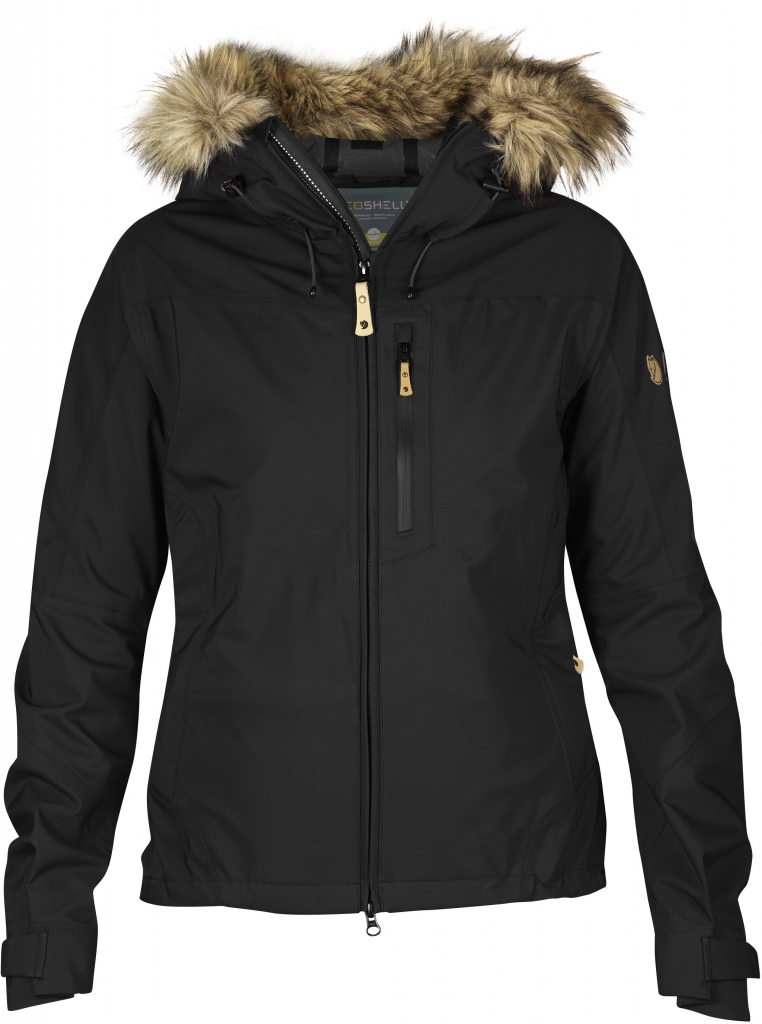 Hoftelang trelags skalljakke i Eco-Shell i resirkulert og resirkulerbar polyester som i tillegg er fluorkarbonfri og klimakompensert. Materialet er vind- og vanntett og slipper ut fukt fra kroppen slik at du har pålitelig beskyttelse mot alle tenkbare værforhold i fjellet. Myk netting på innsiden gir en litt varmere mer tettsittende jakke for alle typer friluftsaktiviteter i den kalde årstiden. Fast justerbar stormhette med refleksbånd bak for å være ekstra synlig på vinterfjellet og avtakbar syntetisk pelskant som beskytter mot vind og snøføyk. Snølås i midjen er festet med glidelås og kan tas ut når du ikke trenger den. Ventilasjonsåpninger under ermene med toveis glidelås. En brystlomme i netting for ekstra ventilasjon to håndlommer og innvendige lommer i netting til for eksempel votter. Toveis glidelås foran med innvendig beskyttelsesklaff og knapp nede. Ermene er formsydde for god bevegelsesfrihet og har borrelåsjustering på mansjettene. Vidden nede justeres fra lommene med en elastisk snor.
