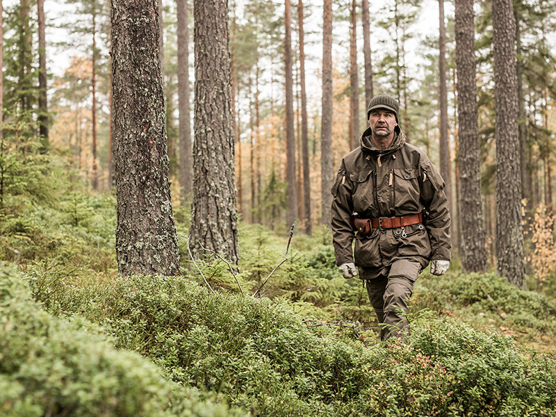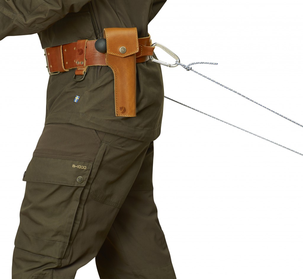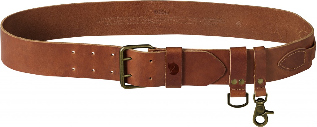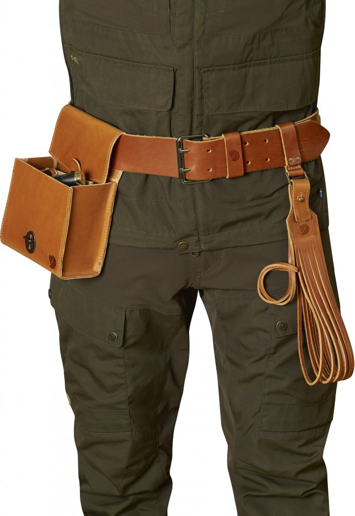 Smart utstyrsbelte av vegetabilsk garvet skinn som bæres utenpå jakken.