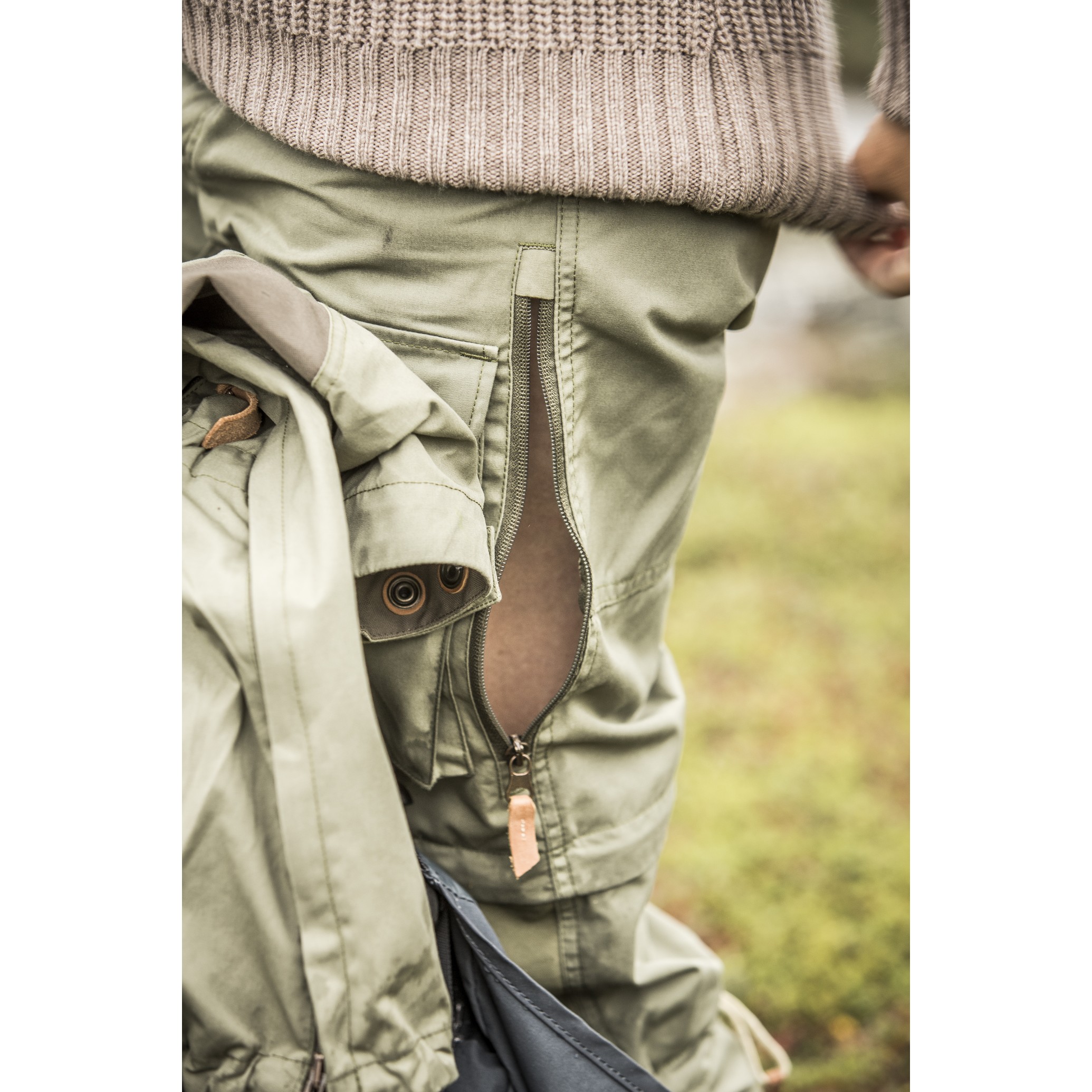 Under kalde værforhold kan buksen brukes over et innerplagg og glidelåsen langs lårene kan åpnes for å slippe inn luft.