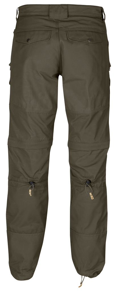 Den delen som tas av har snorjustering i legghøyde som sammen med støvelkroken i falden nederst gjør den om til en gamasje som beskytter bena i tettbevokst terreng enten det er fjell eller jungel.