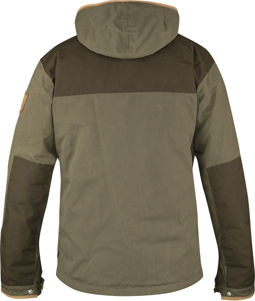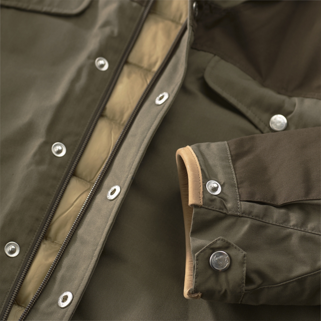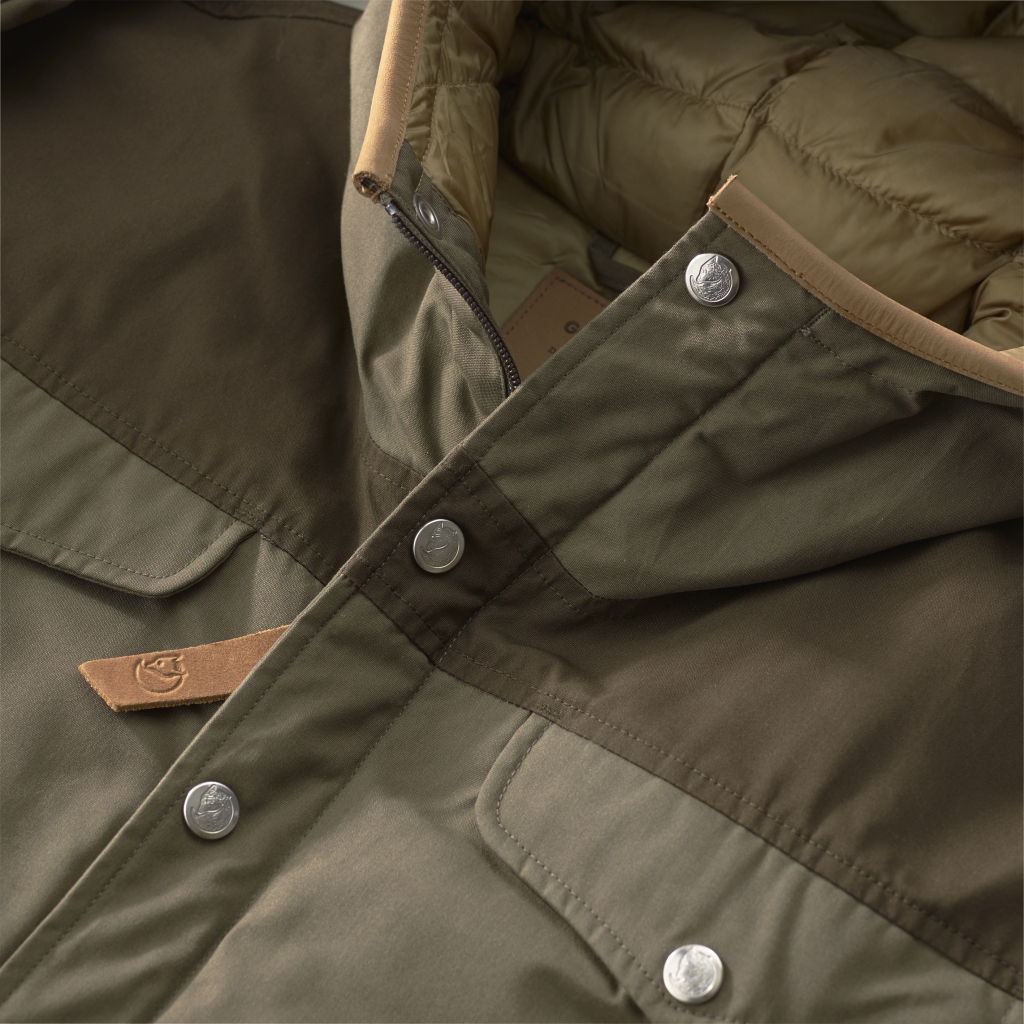 En dunversjon av Fjällrävens mest klassiske jakke med kontrastfarger over skuldrene og på ermene samt skinndetaljer.