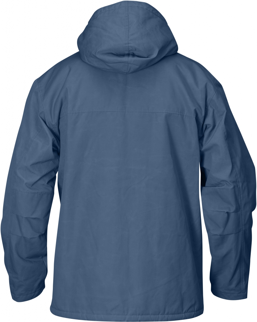Forsterket over skuldrene og i bærestykket. Toveisglidelås med knapper foran og på mansjettene. Tettsittende hette.