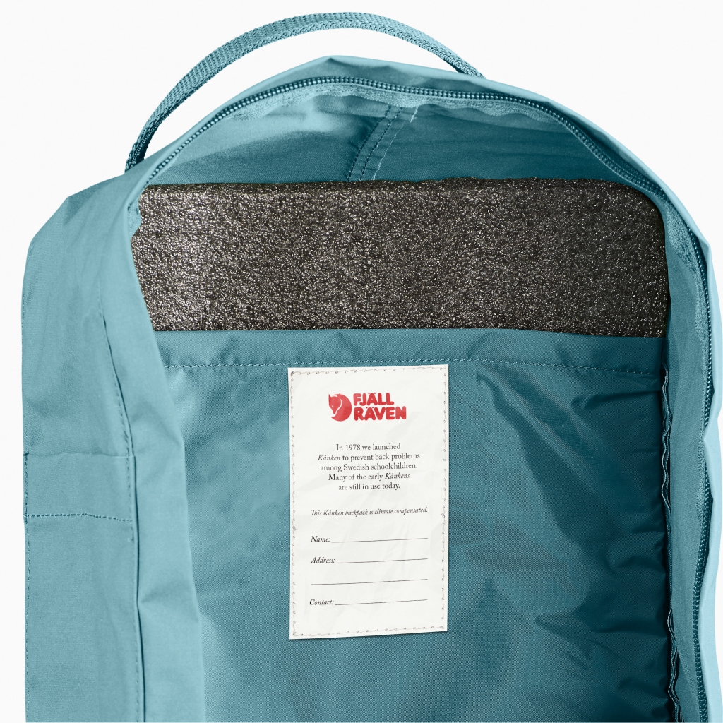 Rette rygger er lykkelige rygger! Kånken ble til så tidlig som i 1978 som et bidrag til å forebygge ryggproblemer blant svenske skolebarn, og den ble raskt et vanlig syn i barnehager og friluftsskoler over hele landet. I dag, 35 år senere, har Kånken rettet opp millioner av rygger verden over og har blitt et av Fjällrävens mest etterspurte produkter. Den klassiske ryggsekken egner seg like godt for turen til og fra skolen eller jobben som til vandreturer og reiser. Materialet er et slitesterkt, lett Vinylon F-stoff som tåler skitt og fuktighet. Det romslige hovedrommet har en stor åpning med glidelås som gjør det enkelt å pakke og ta ut ting. Sekken har to flate sidelommer og en glidelåslomme i front, perfekt for alle småtingene du vil ha lett tilgjengelig. Det medfølgende sitteunderlaget i PE-skum oppbevares i den innvendige baklommen, der det hindrer innholdet i ryggsekken i å stikke deg i ryggen – og det er alltid tilgjengelig når du trenger en pust i bakken og vil sette deg nedpå, uansett hvor du er. Bæresystemet er enkelt, men praktisk og består av håndtak på toppen og smale, justerbare skulderremmer. Logoen på fronten er i refleksmateriale. Sekken har også en adresseetikett i hovedrommet.