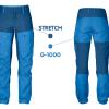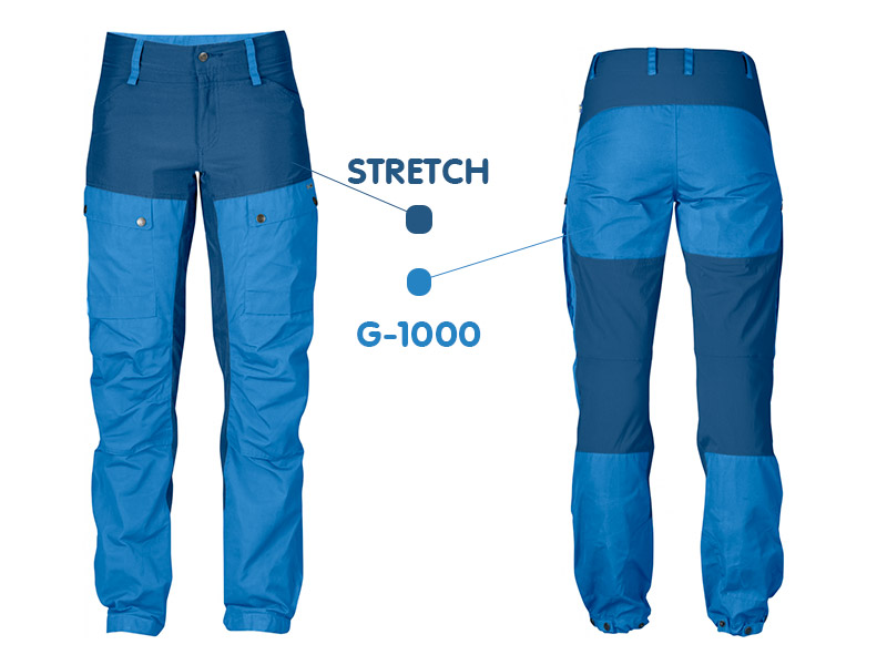 Buksen har i tillegg slitesterkt G-1000 Eco på setet på forsiden av bena over knærne og nederst på innsiden av bena der den er ytterligere forsterket med et dobbelt stofflag for å tåle slitasjen fra fjellstøvlene.