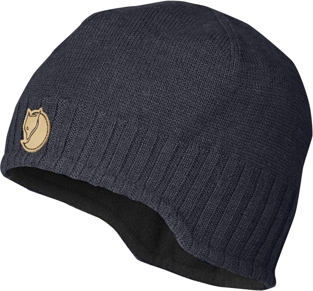 Vindtett lue i ribbestrikket ull-/polyesterblanding fôret med Stormblocker-fleece. Hjelmfasong som er høyere over pannen, men dekker ørene og nakken. Liten logo i skinn midt foran.