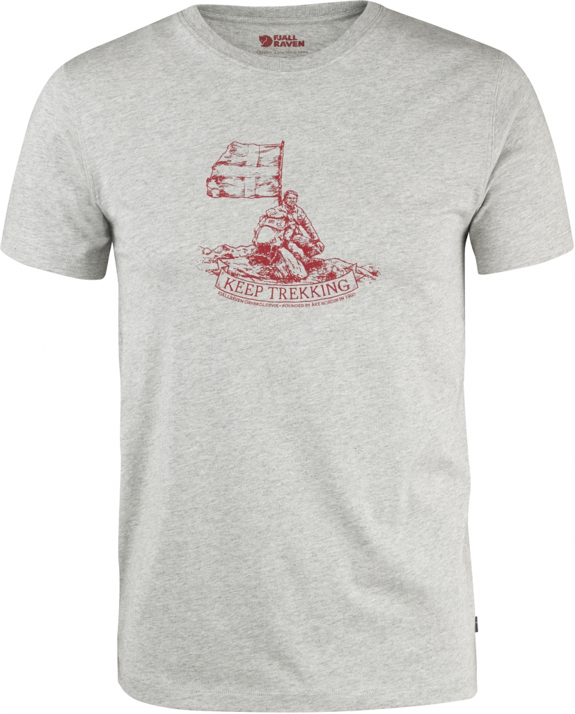 Behagelig kortermet T-skjorte i økologisk bomull. Rund hals og teksttrykk på brystet der det står Keep Trekking.