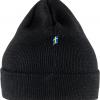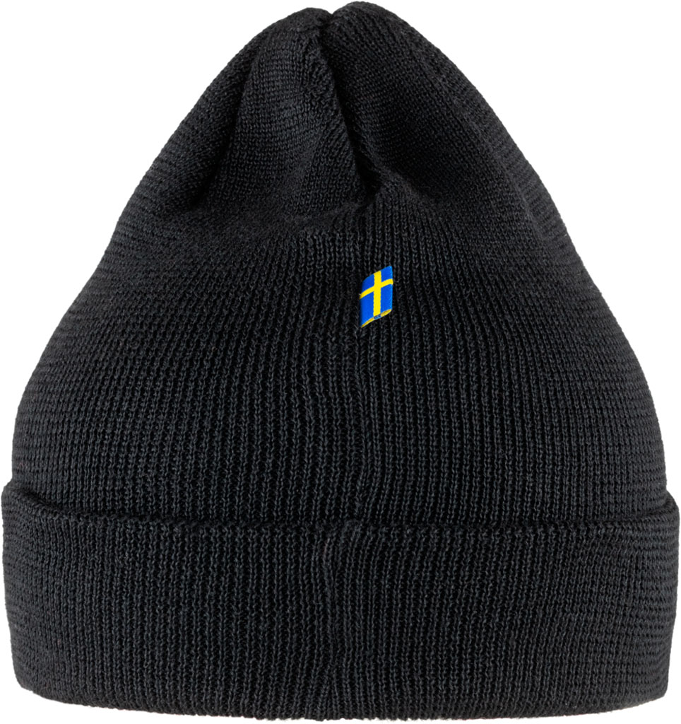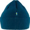 Strikkelue til barn i resirkulert polyester. Myk og god til utendørslek i regn og solskinn, og enkel i vask. Dobbelstrikket med brettekant og et brodert Fjällräven-emblem foran.