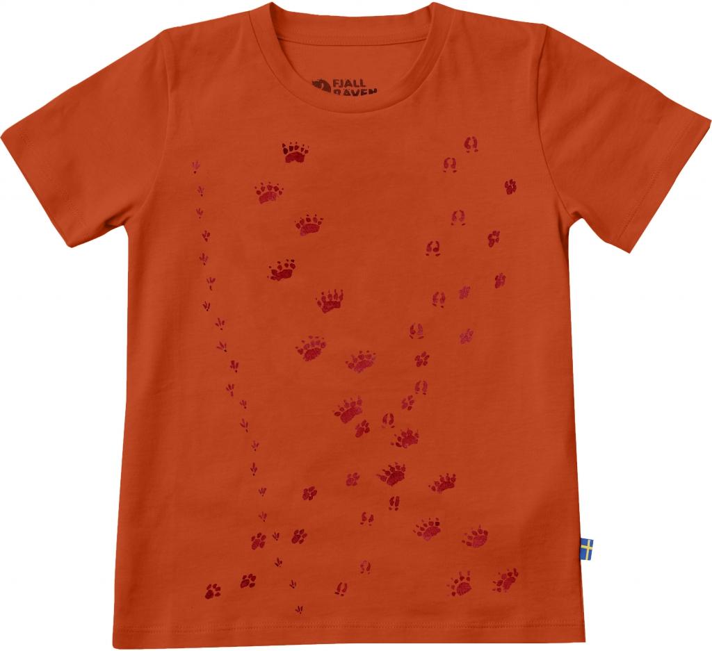 Rund hals og trykt mønster med diverse dyrespor foran.