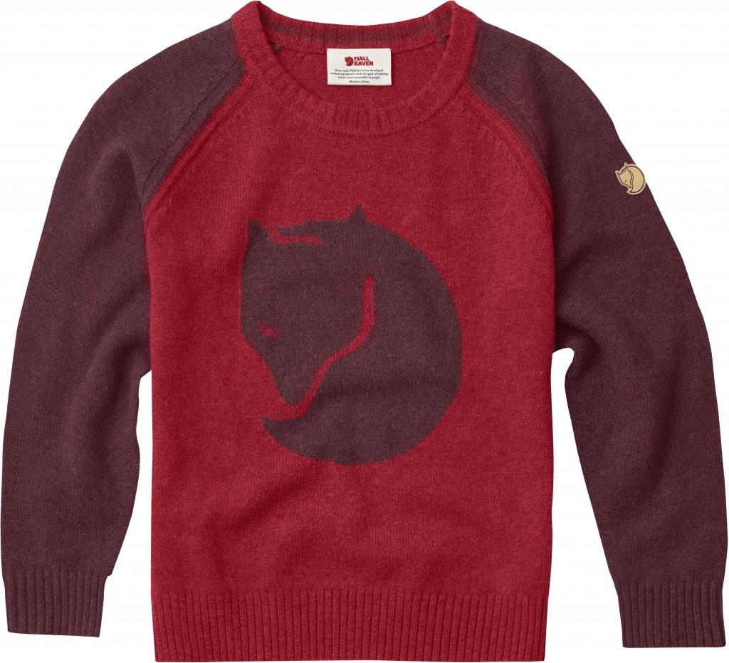 Komfortabel strikket genser i myk varm ull. Et perfekt mellomlag for spennende eventyr ute i skogen eller i snøen. Ullen transporterer fuktighet som bygger seg opp når barna er aktive og den fortsetter å varme selv i fuktig tilstand. Jacquardstrikket logo på forstykket i samme kontrastfarge som ermene. Rund hals og ribbestrikkede mansjetter og nederkant.