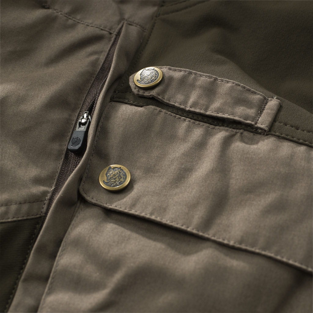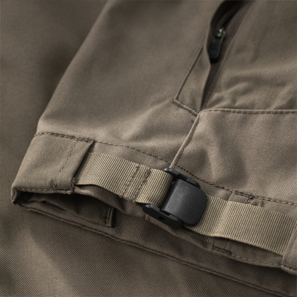 Lett, slitesterk bukse med optimalisert passform til aktive jaktformer. Designet er basert på den prisbelønte Keb Trousers og buksen er laget i elastisk stoff som gir førsteklasses bevegelsesfrihet med værbestandig G-1000 Silent Eco på setet forsiden av lårene over knærne og på innsiden av leggene. Et opplagt førstevalg for fysisk krevende jakt, for eksempel fuglejakt som innebærer plutselige perioder med aktivitet i skiftende terreng eller jakt med hund. Ventilasjonsåpninger med glidelås fra kneet til hoften slipper ut overflødig varme og det er i tillegg glidelås på utsiden av leggene. To romslige benlommer begge med klaff og trykknapp – den på venstre side har også en glidelås, mens den på høyre har en innvendig nettinglomme til en mobiltelefon eller radio. To stikklommer og en knivlomme i tillegg. Sømmen på innsiden av lårene er plassert for å gi minimal risiko for hudirritasjon og det doble stofflaget over leggene kan stå imot slitasje fra støvler. Stroppejustering med knapper holder benavslutningene på plass rundt støvlene og en støvelkrok kan festes til lissene. Forsterkede fester for bukseseler som gjør at eventuelle seler sitter godt.
