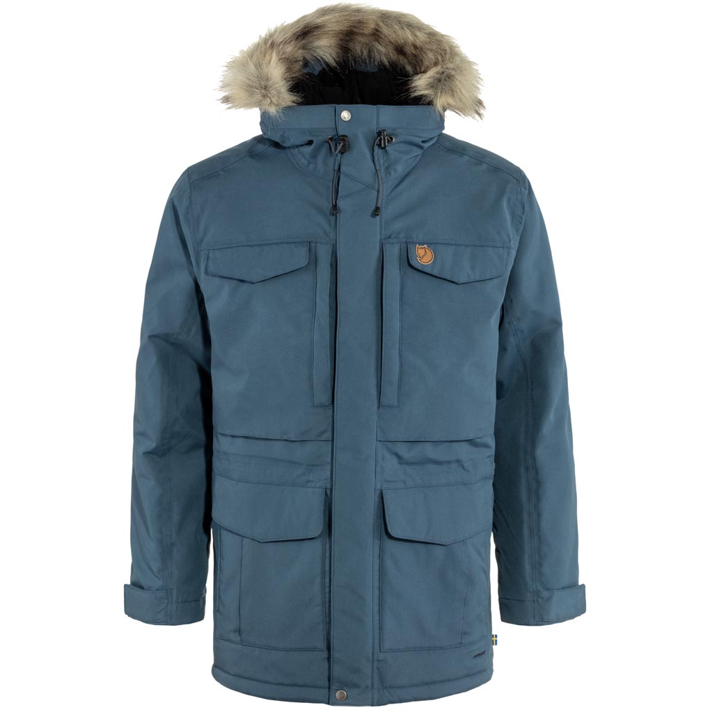 Lang og romslig parkas som rekker over sete og lår. Perfekt valg til skiftende værforhold. Verner godt mot vind og regn, mens en syntetisk polstring holder deg varm når det er veldig kaldt ute. Fleecefôret stormhette med spile i metall og avtagbar kant i fuskepels. Åtte lommer med masse plass til nødvendige ting. Snor i livet og toveis glidelås med klaff for beskyttelse. Oppdatert versjon av Fjällrävens klassiske parkas, nå med bærekraftige stoffer, bedre egenskaper og passform.