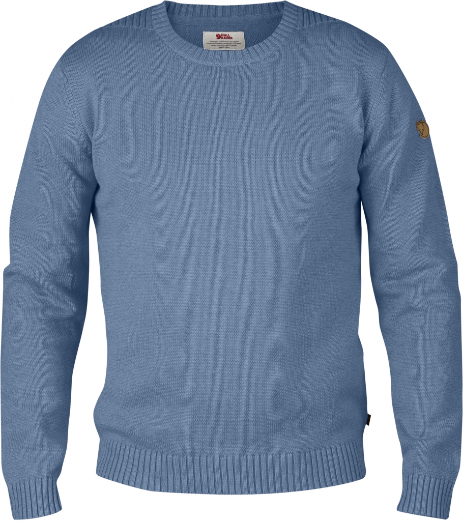 Tidløs glattstrikket genser i myk blanding av bomull og ull. Rund hals og ribbestrikkede mansjetter og nederkant.