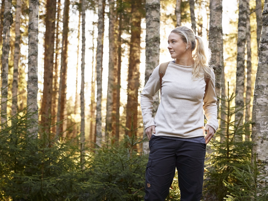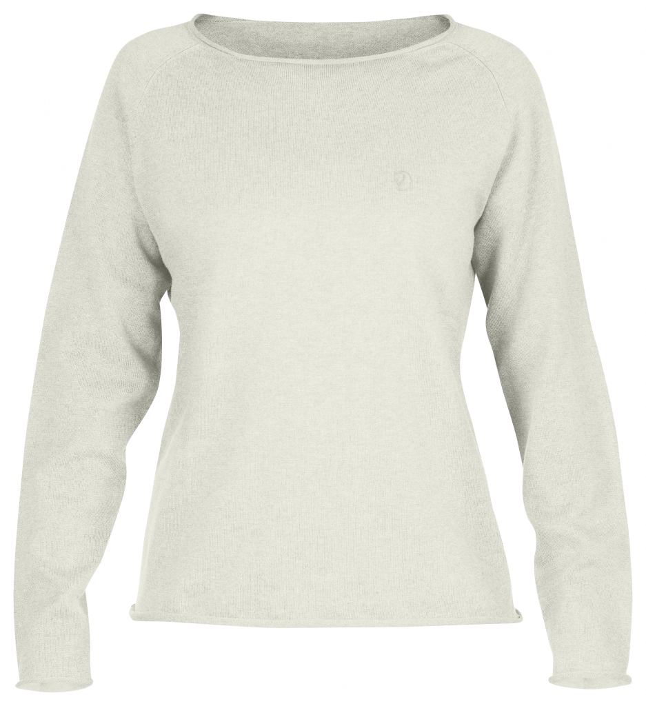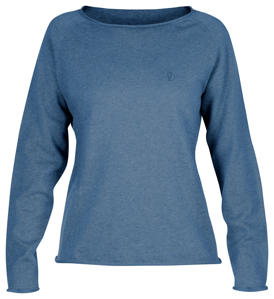 Raglanermer og vid båthals med rullekant. Mansjettene og nederkanten har også rullekanter.