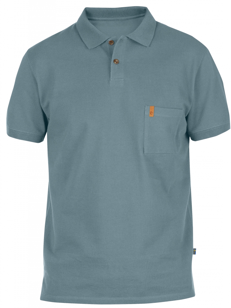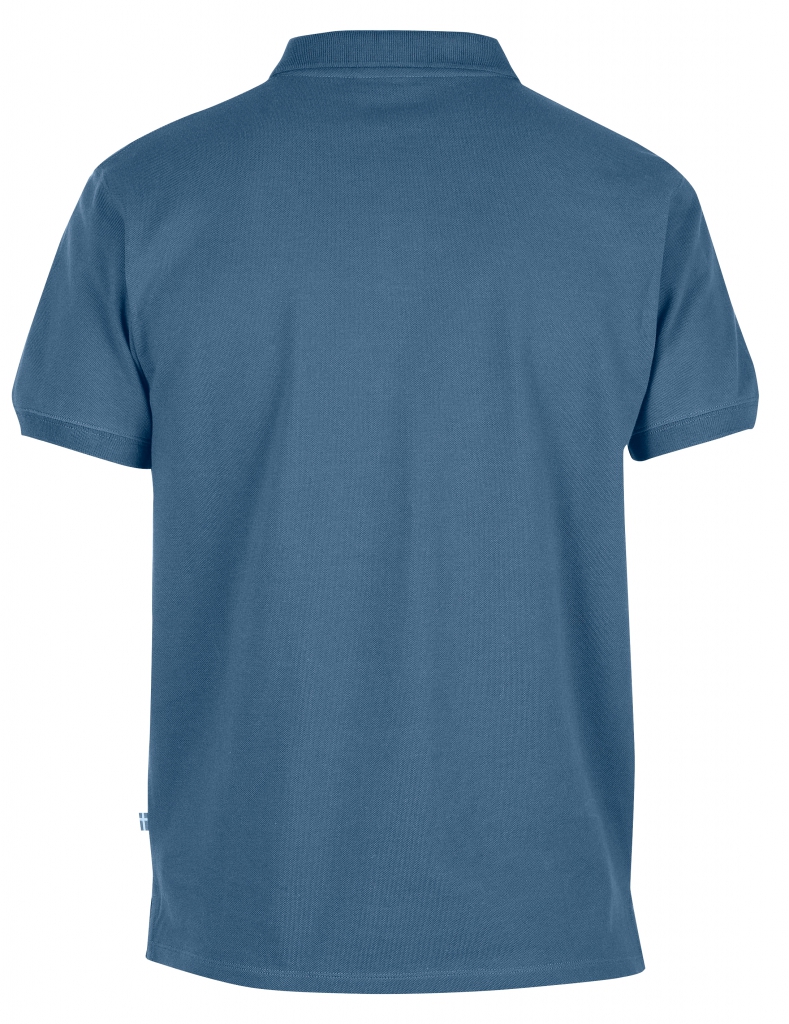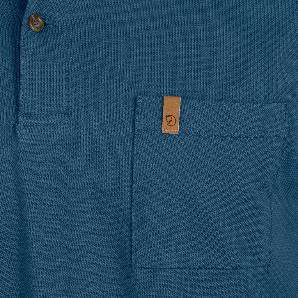 Kortermet pikéskjorte i økologisk bomull. Liten krage to knapper i halsen og brystlomme med en liten brettet logo i skinn.