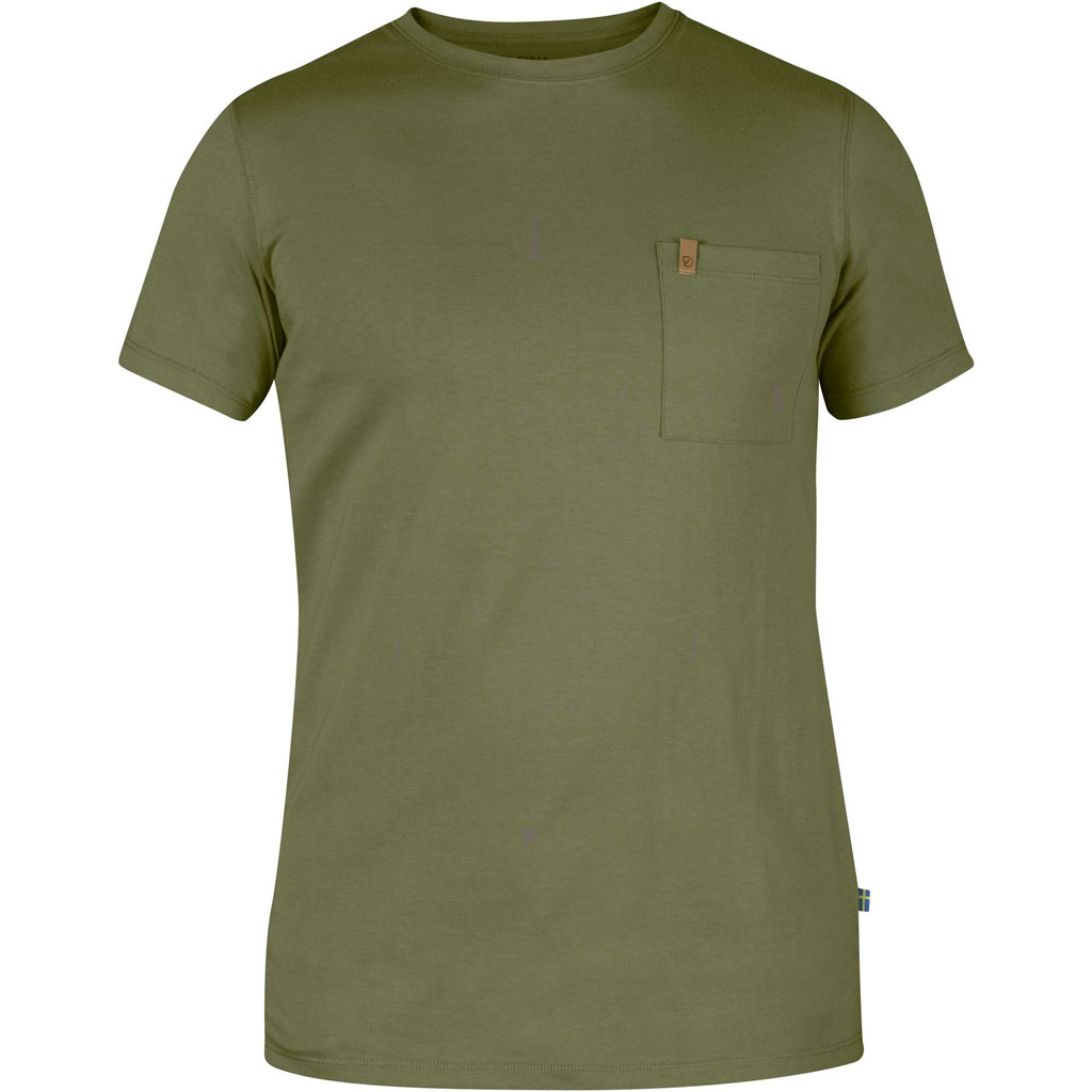 Komfortabel t-skjorte med rund hals og korte ermer, i økologisk bomullsjersey. Brystlomme med Fjällräven-logo i skinn.