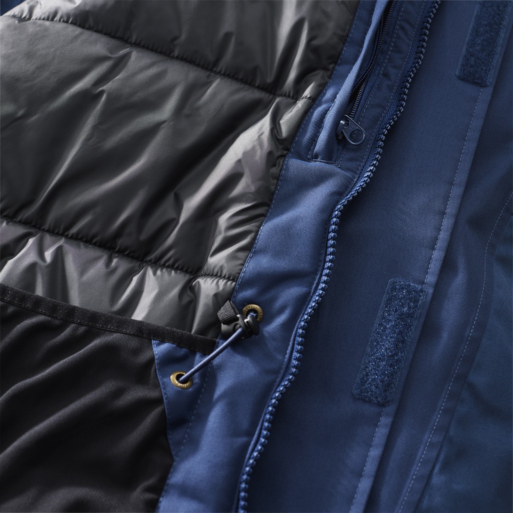 Den toveis glidelåsen kan åpnes nedenfra for ventilasjon og en bred beskyttelsesklaff stenger den kalde vinden ute.