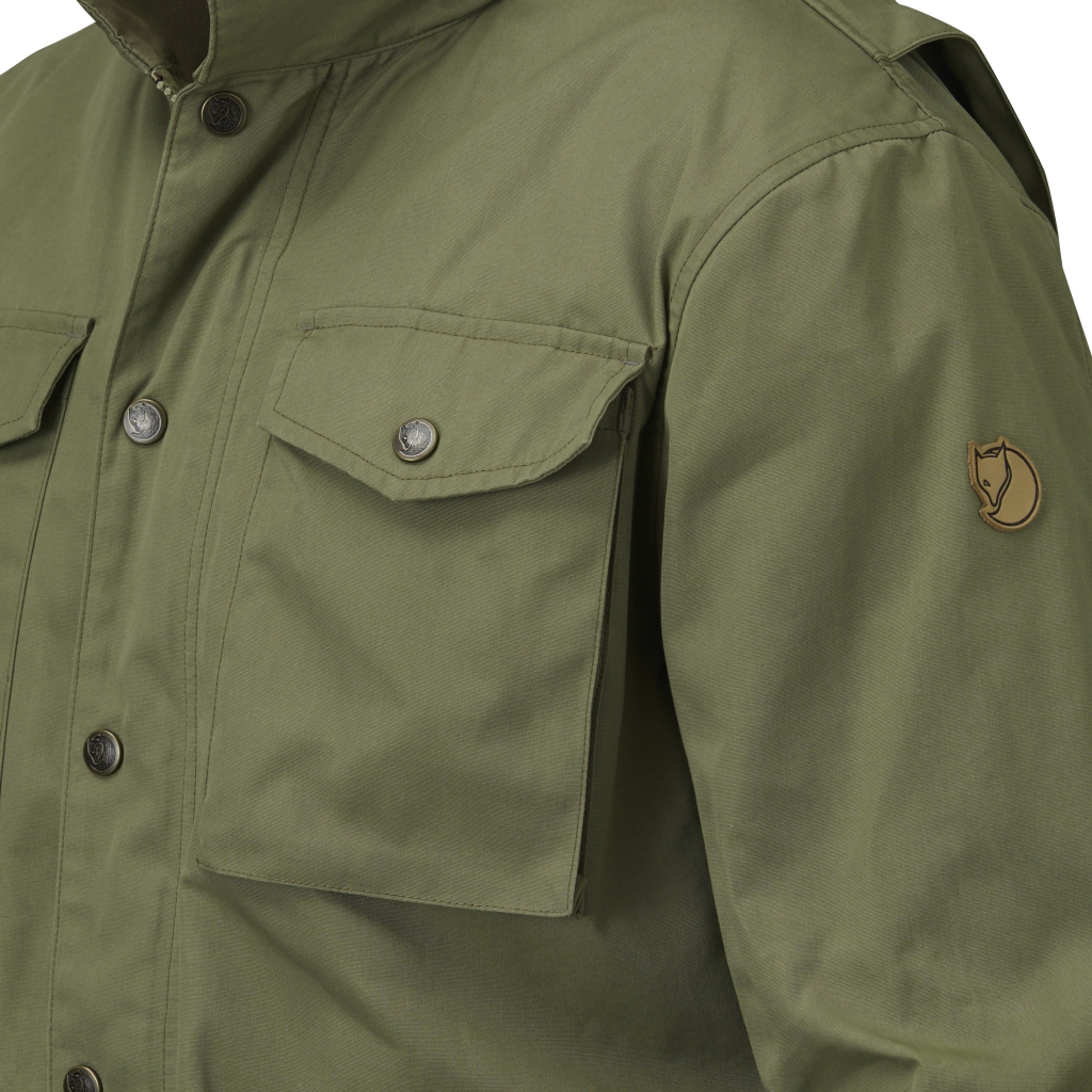 Tidløs friluftsjakke med en slitestyrke og anvendelighet som er akkurat like nyttig i dag som da den først ble lansert på slutten av 1970-tallet. Denne nye versjonen er laget av G-1000 Eco i gjenvunnet polyester og økologisk bomull. Den er vind- og vannavstøtende og passer til både hverdagsbruk og generelt friluftsliv. Den har en fast hette i en smidig blanding av polyamid og økologisk bomull og hetten kan rulles inn i kragen når den ikke er i bruk. Brystlommene har plass til gjenstander du trenger å ha for hånden og lenger nede er det store belglommer med toppåpning og ekstra sideåpning. En toveis glidelås er skjult bak en beskyttende klaff med trykknapper. Belgfolder på skuldrene og ekstra folder på albuene gir førsteklasses bevegelsesfrihet mens snorjustering i midjen og nederst sørger for en god passform. Mansjettene kan justeres ved hjelp av trykknapper. Med Greenland Wax kan jakken enkelt tilpasses været og de valgte aktivitetene. Mer voks forsterker både jakkens vind- og vannavstøtende egenskaper og dens slitestyrke og levetid. Med mindre voks er jakken sval og har maksimal ventilasjon.