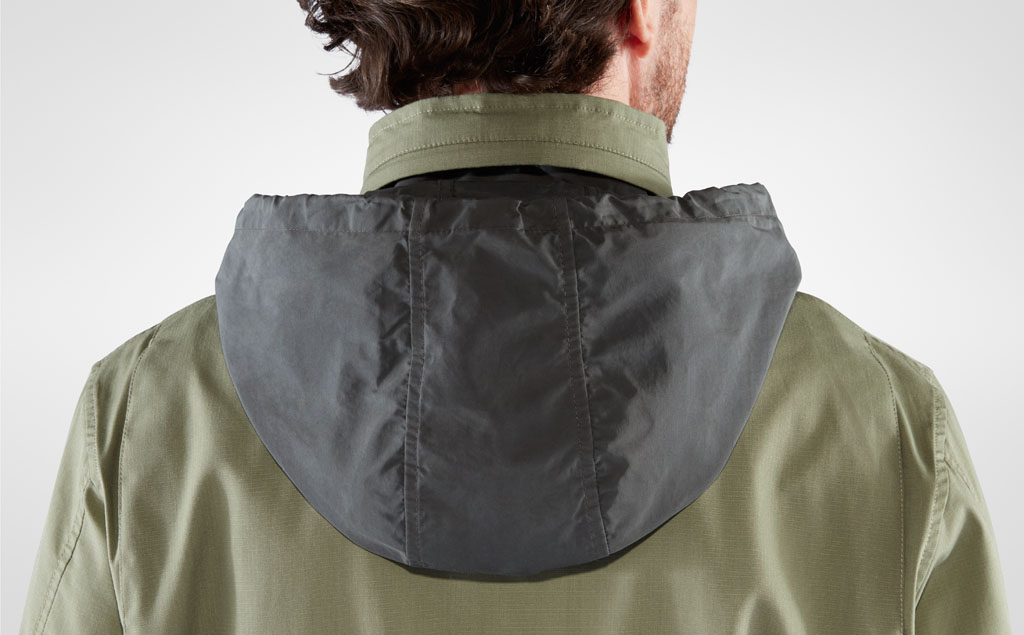 Hetten kan brettes inn i kragen, og den har en rekke praktiske lommer, inkludert de karakteristiske belglommene med ekstra glidelåsåpninger på sidene.