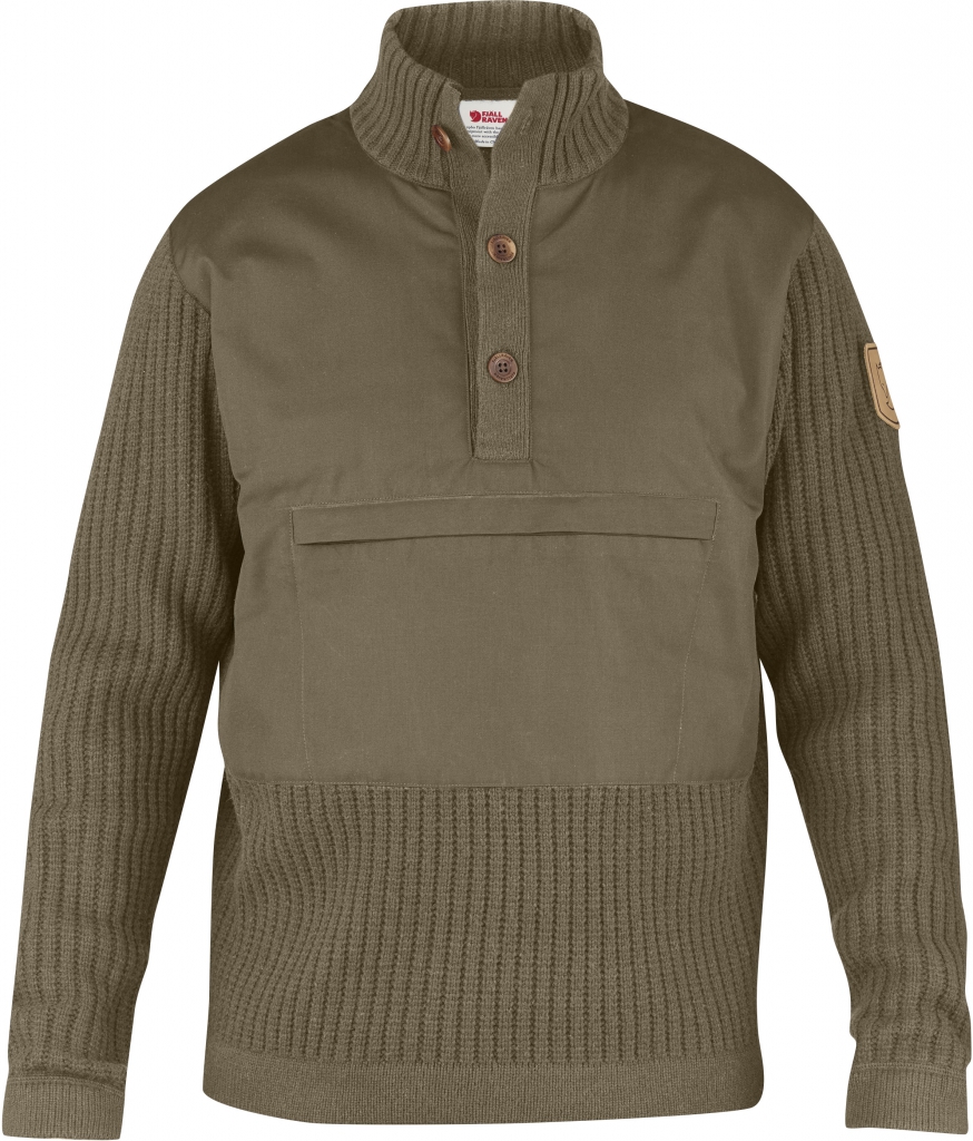 Varm robust genser i lammeull med vindavstøtende G-1000 på bryststykket. Høy krage med knapping og en kengurulomme på forstykket.