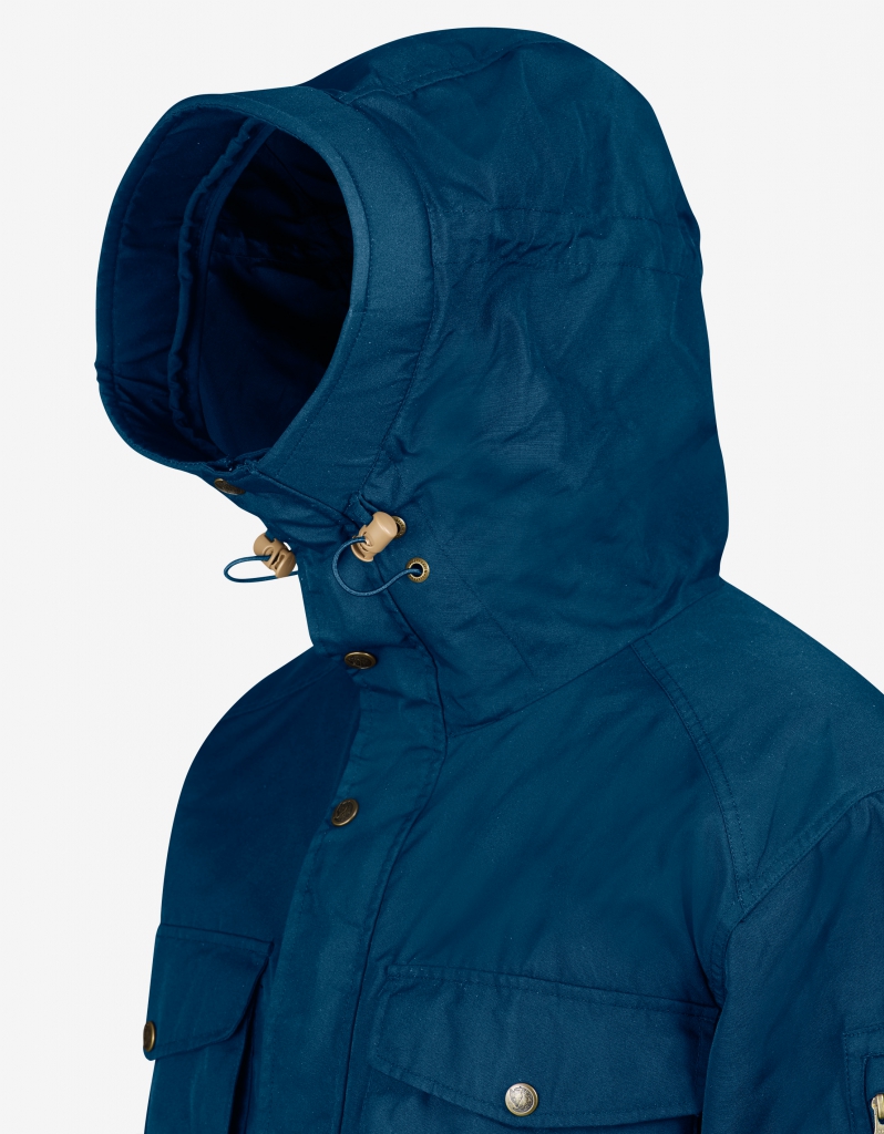 En romslig hette med skygge som kan brettes, beskytter mot kalde vinder og kan justeres slik at den passer perfekt til hodet. Toveis glidelås som kan åpnes nedenfra for ventilasjon, og en bred beskyttelsesklaff med knapper holder den kalde vinden ute. Mange lommer, for eksempel de romslige, vertikale brystlommene med glidelås og påsydde lommer med klaffelukking og knapper utenpå, til praktisk oppbevaring av ting det er nødvendig å ha lett tilgjengelige. Det er også to nedre lommer med toppåpning og en ermelomme med glidelås til GPS eller lignende. Snor i midjen og i nederkant, og borrelås på mansjettene.