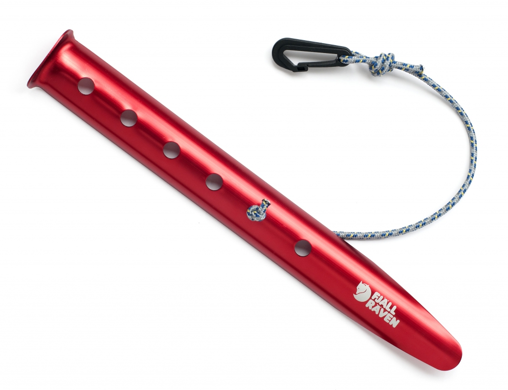 Lang, bred teltplugg i aluminium som gir stabilt feste i snø og sand. Snor med plastkarabiner kan festes i teltbardunen.