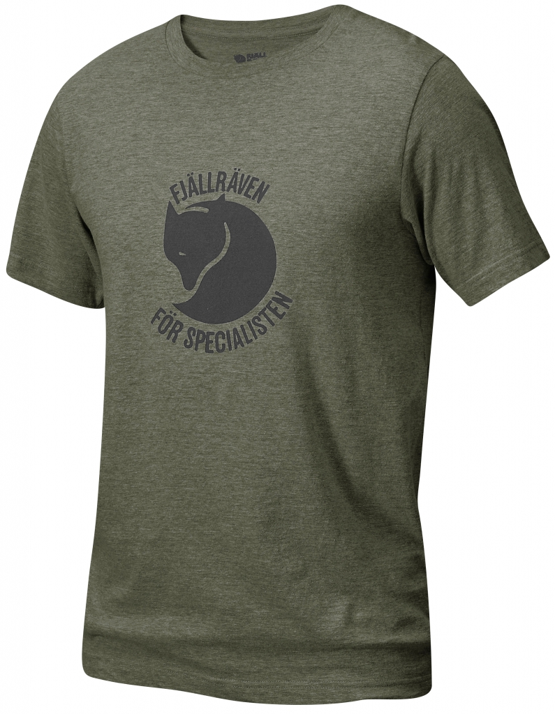 Kortermet T-skjorte med normal passform i deilig økologisk bomull. Rund halsringing og trykk med Fjellreven-silhuett og teksten Fjellreven för specialister foran.