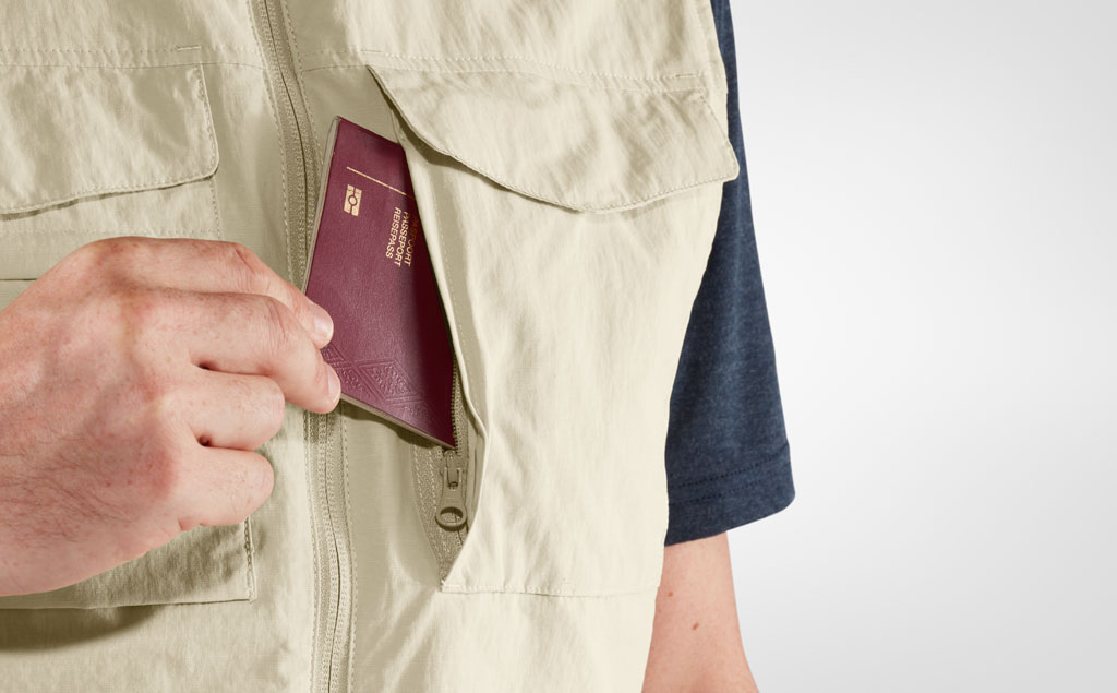 Praktisk reisevest som er behagelig selv på veldig varme dager. Laget av sval og hurtigtørkende MT Eco som ikke krøller seg lett – praktisk når du er på farten. Åtte lommer for sikker oppbevaring av småting du trenger i nærheten. De to brystlommene har toppåpning og glidelåsrom, og det er rikelig med plass til reisedokumenter og bankkort. Velpassende passform med en toveis glidelås på fremsiden.