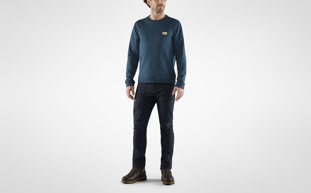 Vardag betyr hverdag på svensk, og denne genseren har alt du vil ha i en absolutt favoritt til hverdagen. Tidløs design med rund hals, mansjetter og fald i vrangbord og en klassisk logo fra Fjällräven på brystet. Laget av komfortabel økologisk bomullsjersey med løkkestrikk på vrangen, og er perfekt til bruk både i byen og på turer i helgene.