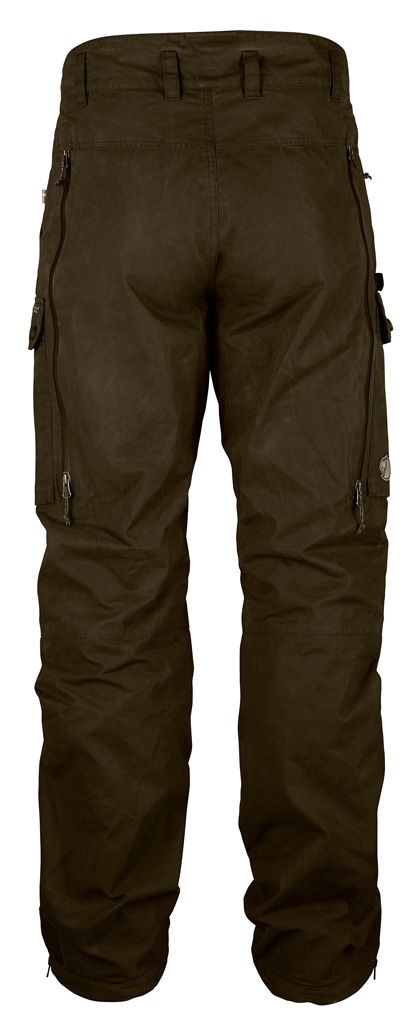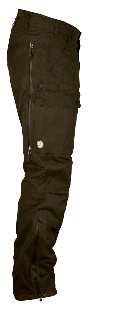 Forsterkede felt i linningen sørger for sikkert feste av bukseseler. Buksen har to romslige benlommer, den høyre med ekstra rom til en kniv eller øks, i tillegg til stikklommer og baklommer. Ventilasjonsglidelåser fra hofter til knær og nedover leggene slipper ut overflødig varme, og sistnevnte gjør det også enklere å ta buksen av og på. Formsydde knær med lommer til kneputer (tilbehør) for ekstra varme og komfort når du sitter på knærne.