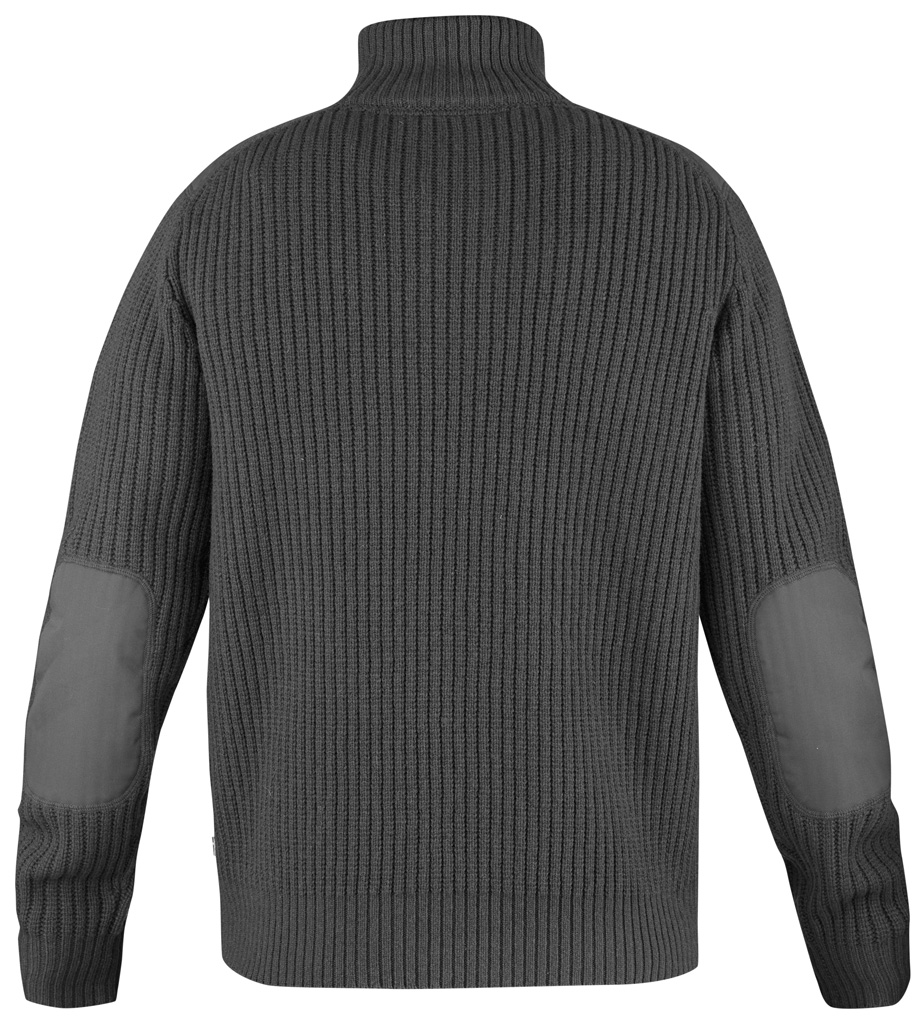 Myk og varm strikket genser i lammeull med G-1000 Silent Eco på skuldrene. Høy krage med halvlang glidelås og knapping i front.
