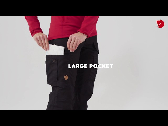 Utstyrt med knebeskytterlommer (tilbehør). Dette plagget kan impregneres med Fjällrävens Greenland Wax. Buksen finnes også i kort versjon som er 5 cm kortere (F89335S).