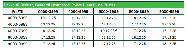 - Pakke til hentested: +en ekstra dag fra 24. november til 4. januar 2026.