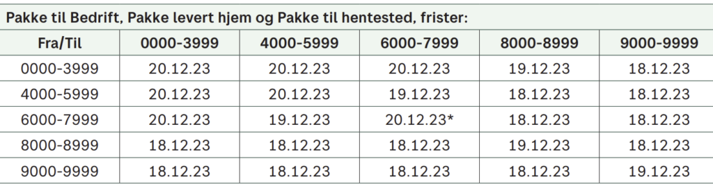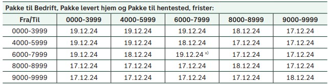 - Pakke til hentested: +en ekstra dag fra 24. november til 4. januar 2026.